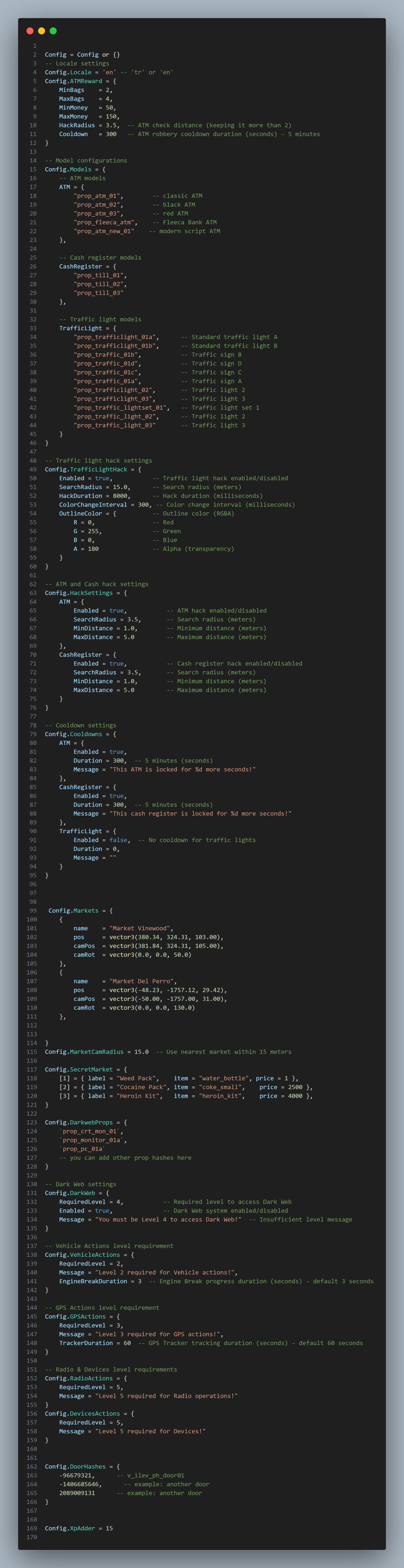 • Vehicle Lock Control — Open/close doors with distance/class affecting success odds
