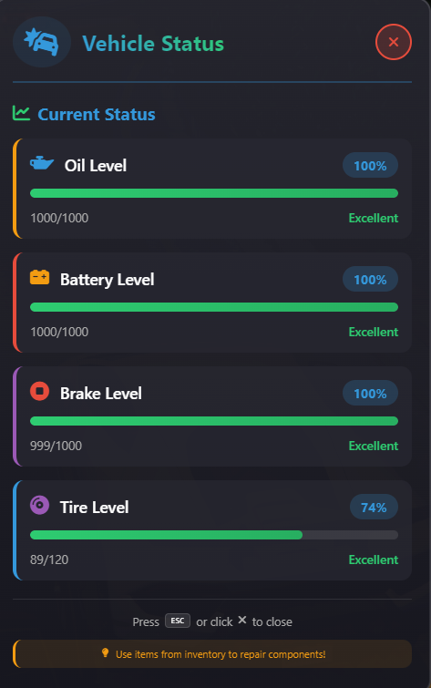 Introducing Vehicle Maintenance System v1.1.0 , a comprehensive overhaul that transforms vehicle ownership into an immersive, realistic experience. This advanced system requires players to properly maintain their vehicles through four distinct component systems, each with unique degradation patterns and realistic effects.
