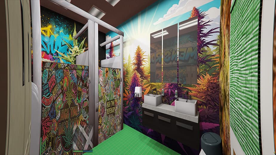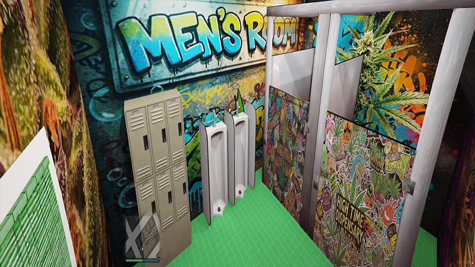 :mens:Men’s Room: A gritty space with “MEN’S ROOM” graffiti, urinals, lockers, and colorful cannabis-themed wall art for immersion.