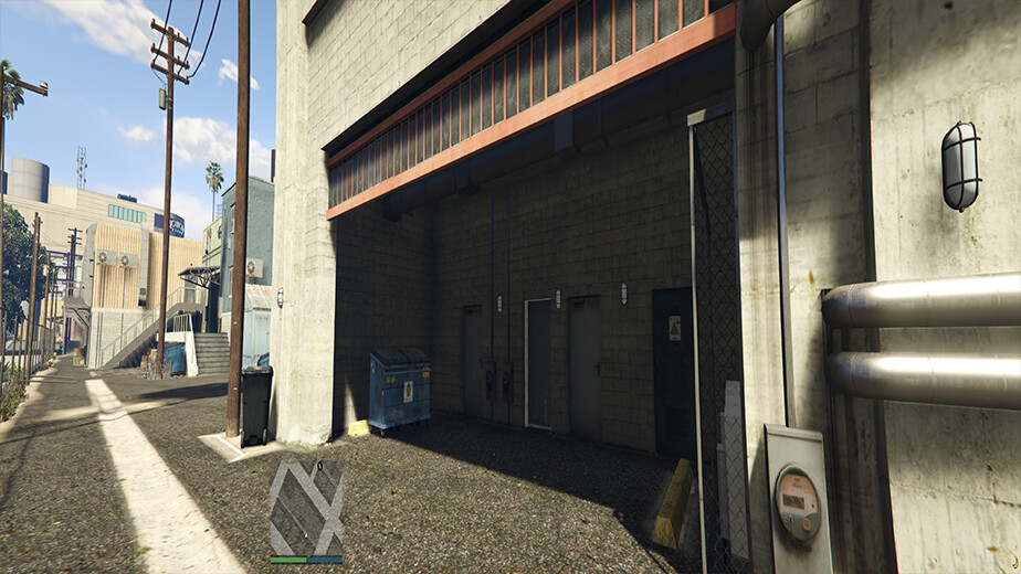 :package:Functional Loading Bay: A back door with employee parking, a dumpster, and utility details, ideal for supply runs or discreet roleplay scenarios.