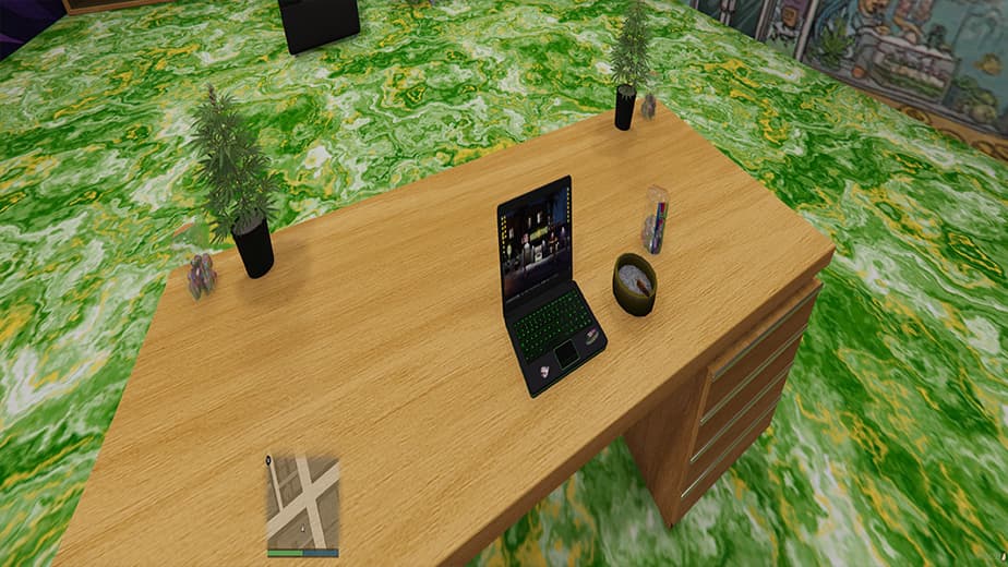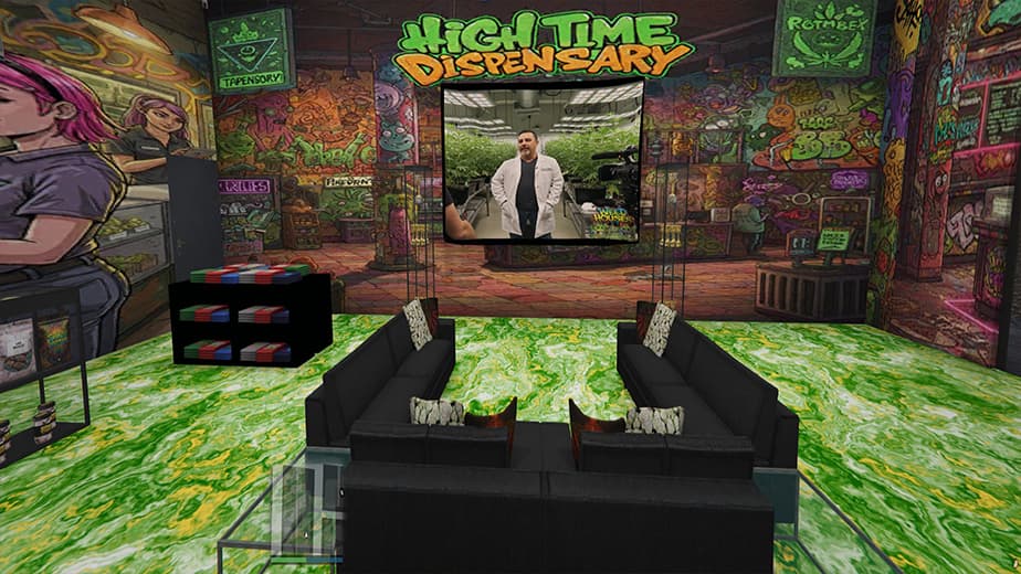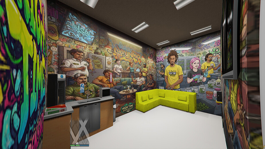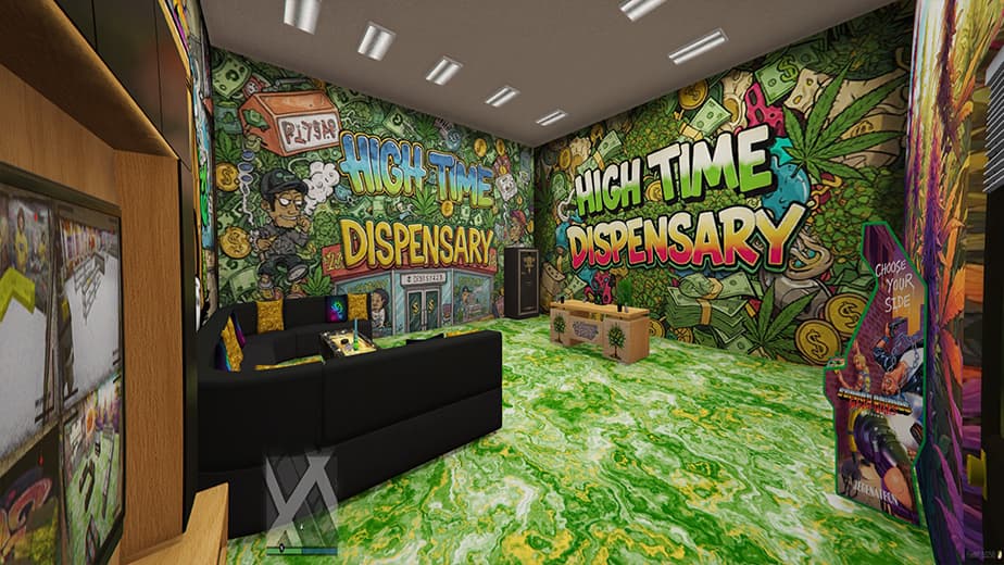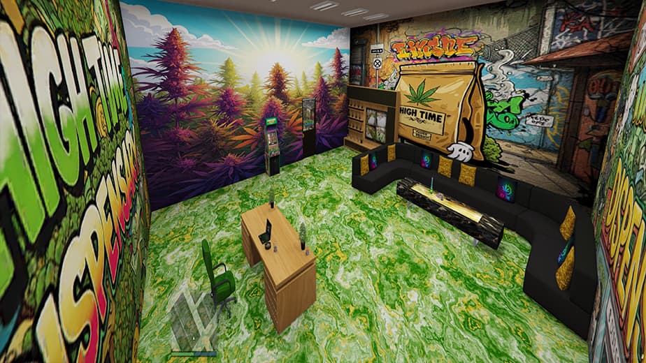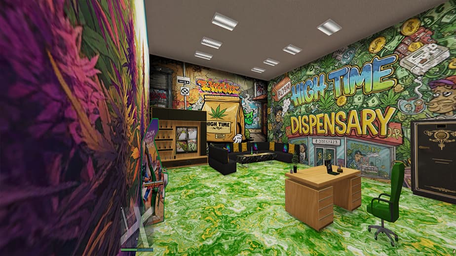 :card_file_box:Boss Office: A private office with a “High Time Dispensary” sign, vibrant cannabis murals, and a desk setup for managing in-game business or hosting VIP meetings.