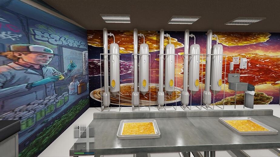 :oil_drum:Concentrate Room: A high-tech extraction lab with stainless steel counters, large extraction tanks, trays of concentrates, and graffiti art like “Crumble” for personality.