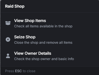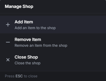 • Zone checks: Shops can only be created in specific areas defined in Config.Zones.