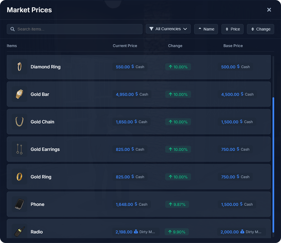 A real-time market overview showing current prices of all available items in the pawnshop system. This page acts as a live marketplace monitor, displaying up-to-date prices, market activity, and price changes for each item. It helps players track market trends and make informed selling decisions.