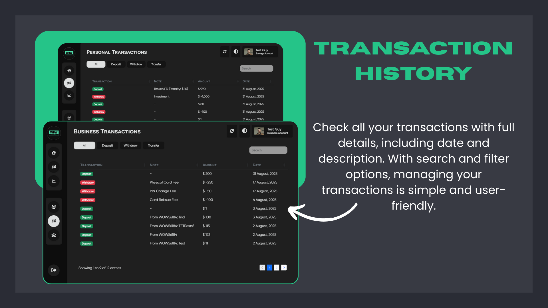 View detailed history with description and date with search and filter transactions for quick accessIBAN (Account Number) Feature: