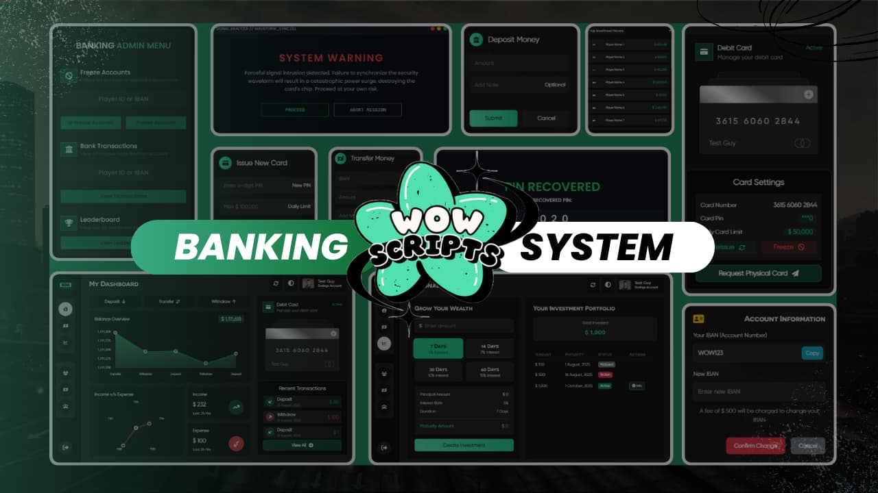 UnknownComplete Banking System brings realism and depth to your server. Packed with features like personal and business accounts, debit card management, investments, ATMs, IBAN, admin controls, and even card hacking this script is designed to give players a complete and immersive banking experience.