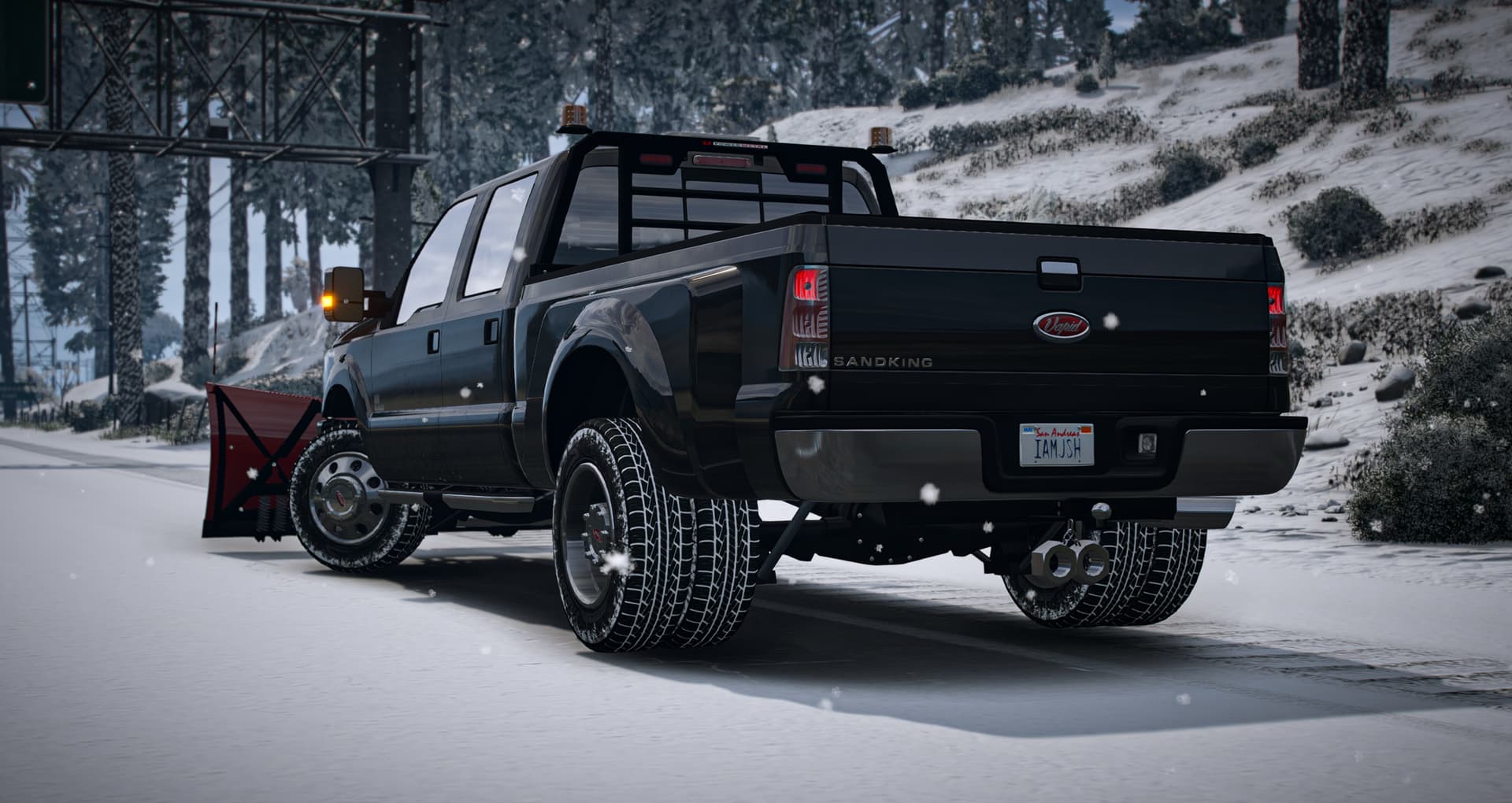 The Vapid Sandking goes full public works. This variant of the D155 is purpose-built for winter RP; heavy-duty front plow, optional salt spreader bed, and enough weight to move snow and other vehicles… and into the air…