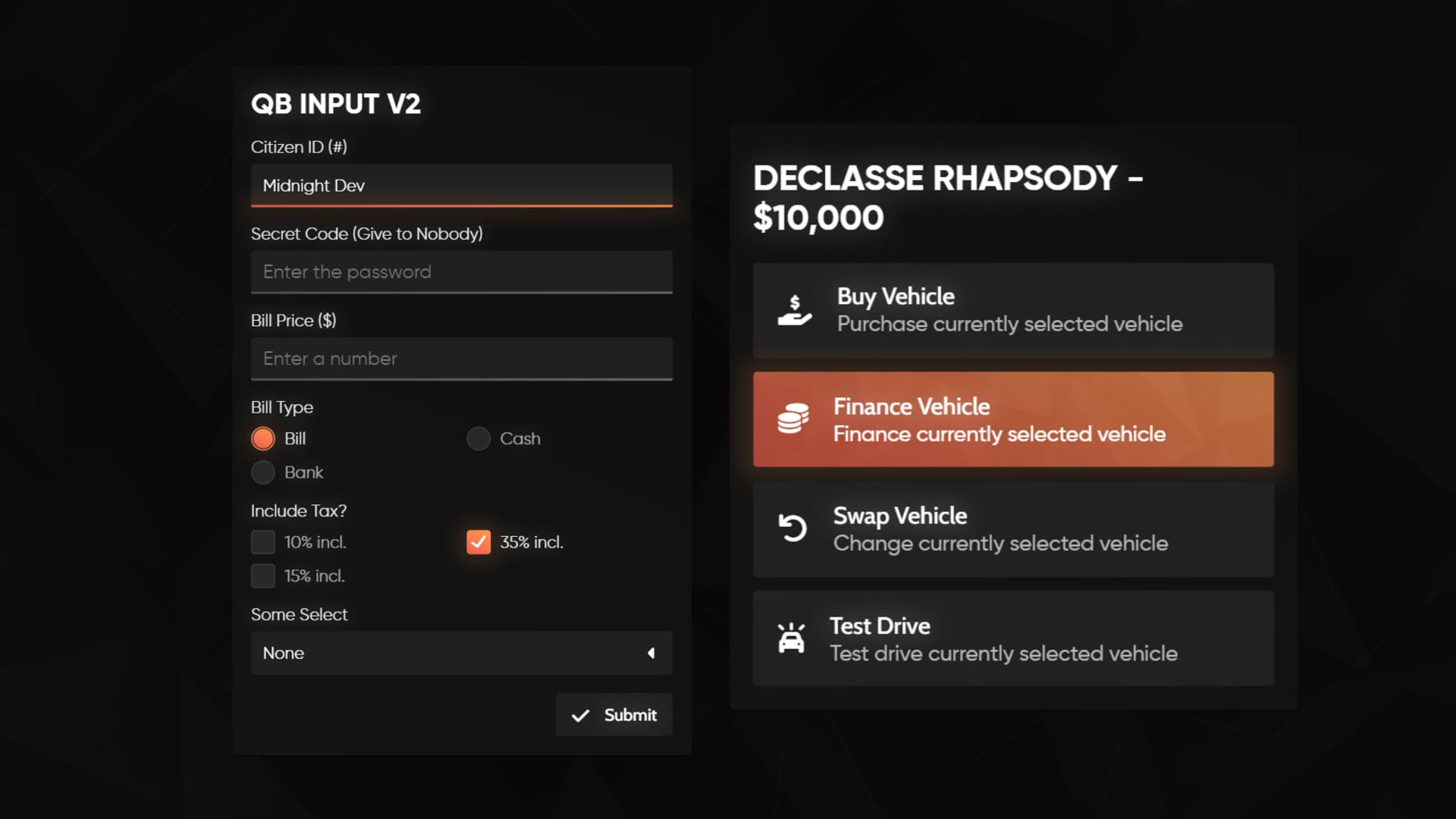 $2.99Looking for a menu and input that doesn’t just work — but feels good to use? The QB input/menu from Midnight Dev is built for speed, style, and sanity. With a clean layout and buttery-smooth interactions, players can find what they need instantly thanks to a built-in, unique search function that cuts through clutter like a hot knife, and sort button that reshapes the list by price. No more endless scrolling or clunky clicks. Just fast, intuitive and wrapped in a beautifully crafted UI. Plug it in, and your server starts feeling premium.