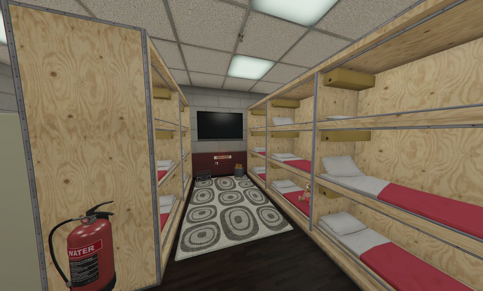 Includes a garage for vehicles, offices with a meeting table, a canteen, shower facilities, sleeping barracks, locker rooms, toilets, and a chief’s office.