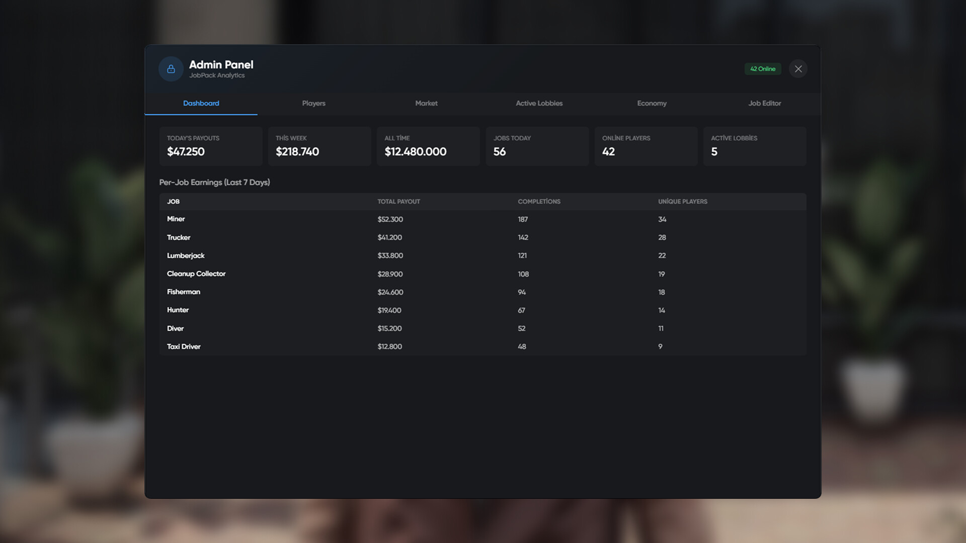 Job Center UI; Central hub where players can browse jobs, see statistics, and select tasks dynamically.