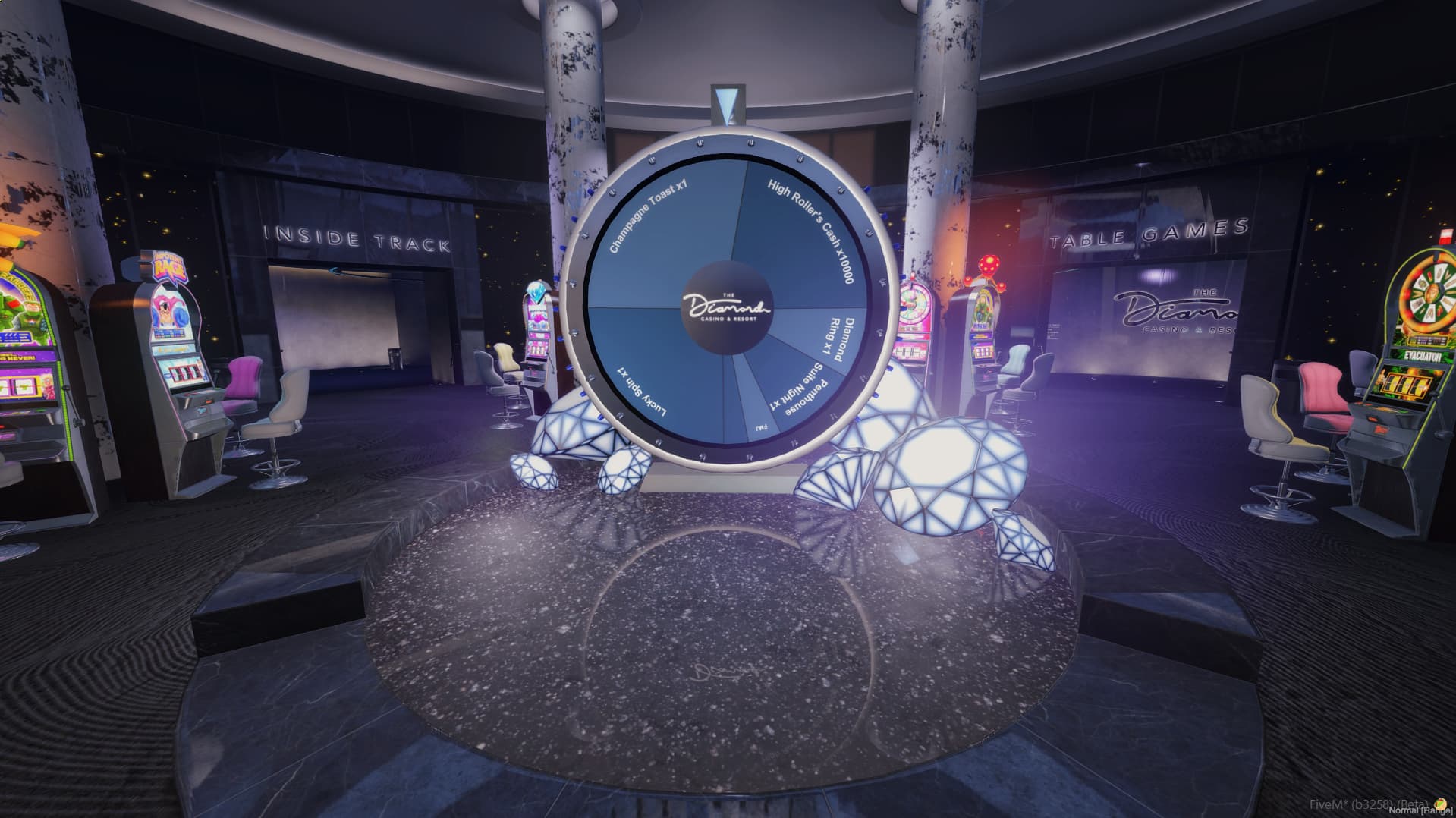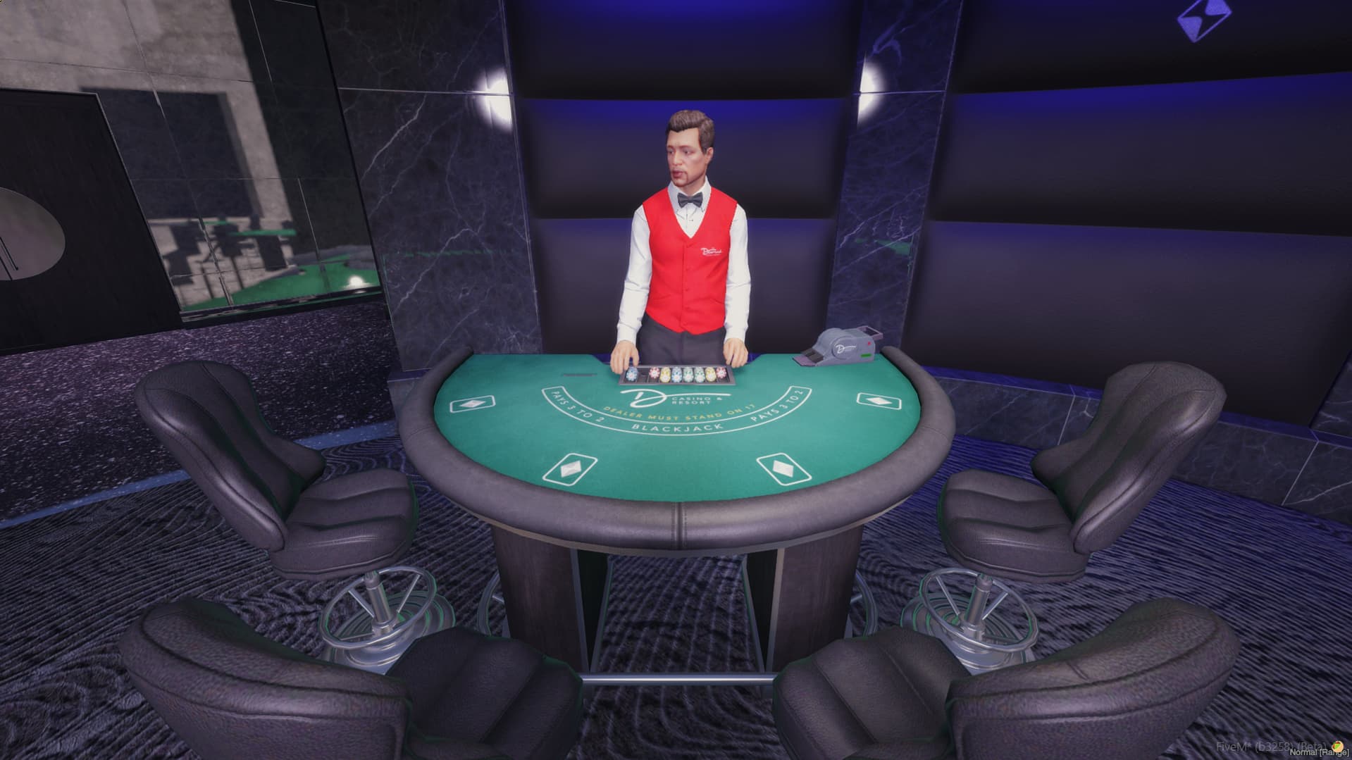 Complete Casino System is a multiplayer casino script for FiveM servers. It adds a full casino environment where players can play together at the same tables instead of using separate minigames. Players can join blackjack, roulette, poker, or slot machines, spin the lucky wheel, exchange chips at the cashier, or grab drinks at the bar.