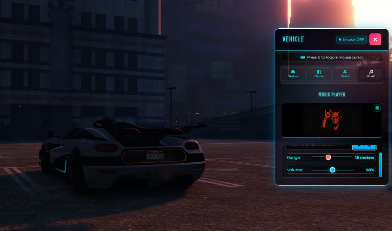 CAR MENU v2.0 is a modern, all-in-one vehicle control system designed for FiveM servers, giving players full control over their vehicles with an intuitive and feature-packed interface. Elevate your driving experience with precise controls, built-in entertainment, and advanced safety features! NEW v2.0: Now with draggable interface, QBox support, and ultra-optimized performance!