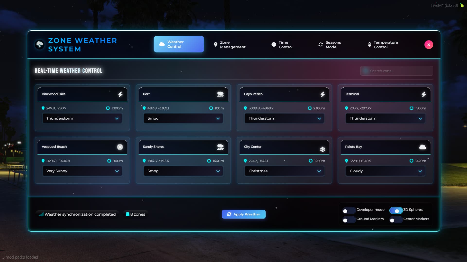 ZONE WEATHER SYSTEM v3.0ZONE WEATHER SYSTEM v3.0 is a revolutionary, feature-rich weather system designed for FiveM servers. With dynamic zone-based climates, seamless transitions, advanced time control, realistic time system, intelligent seasons mode, and a complete temperature system, it brings immersive and realistic weather control to your RP environment.