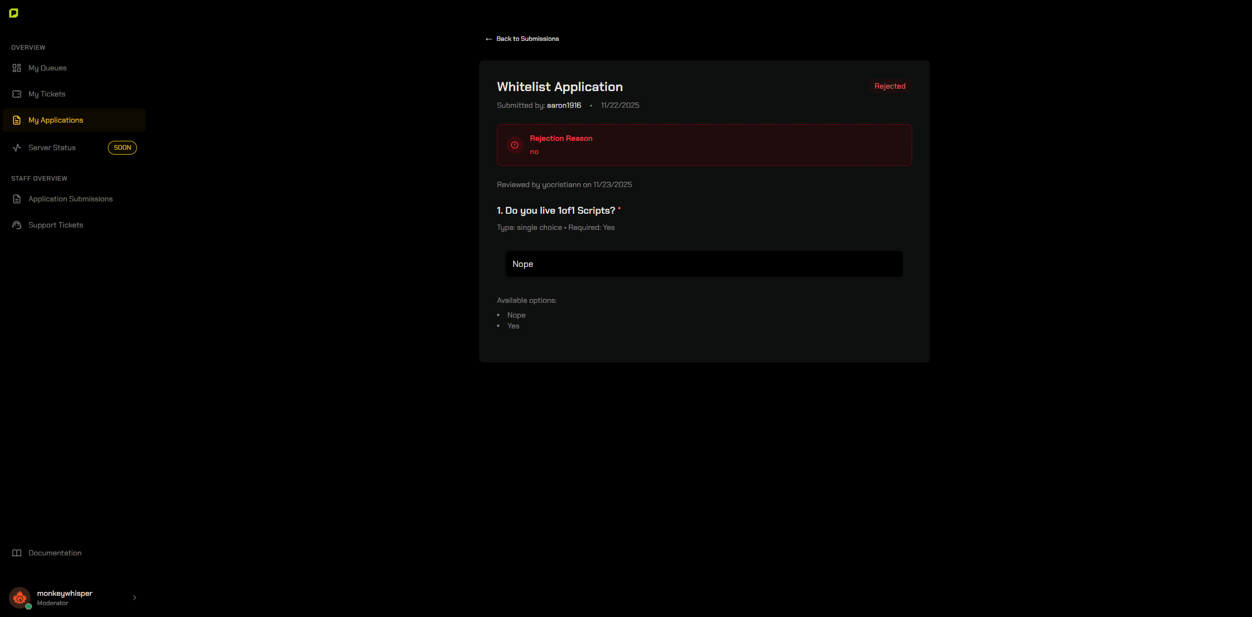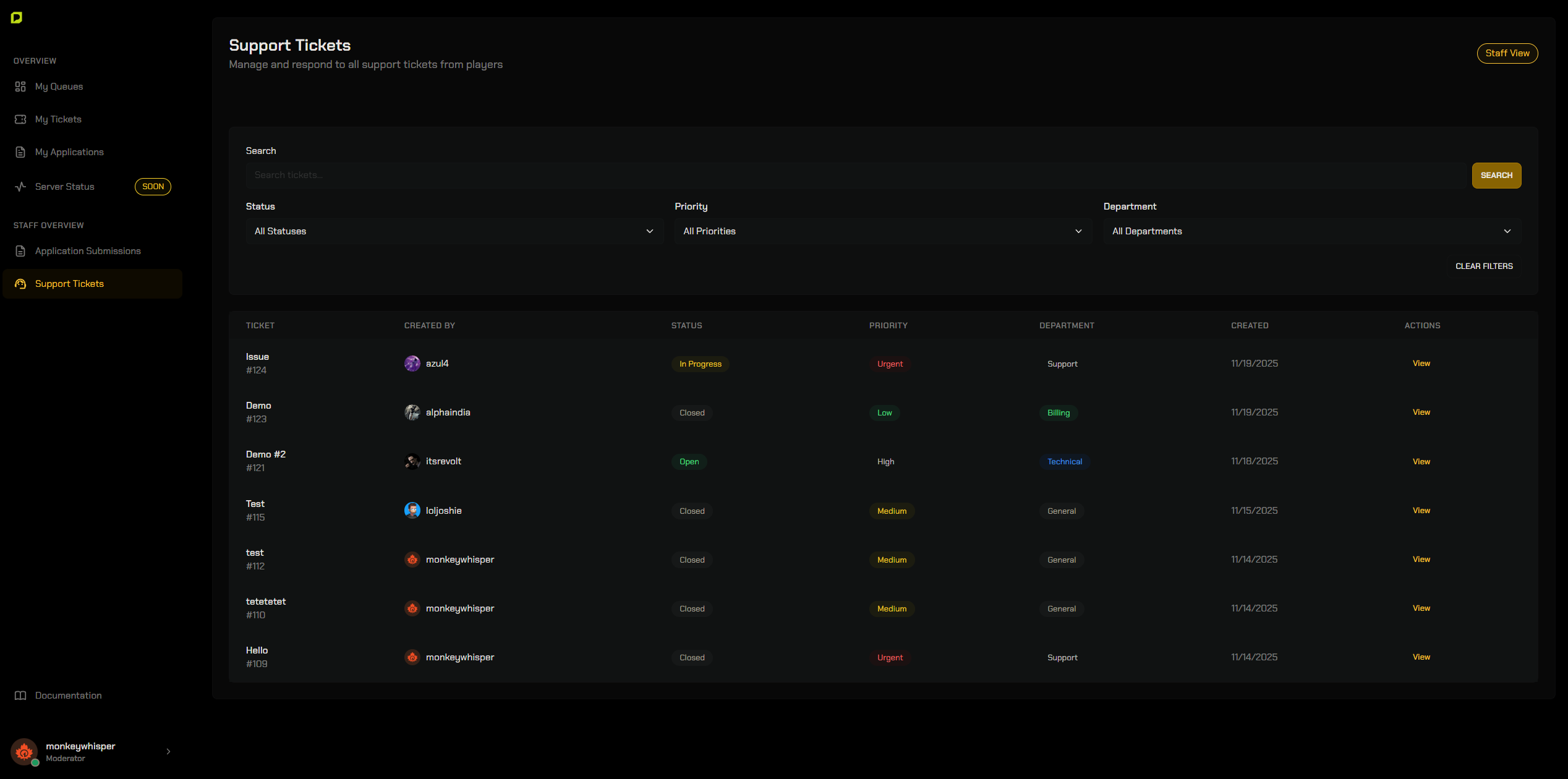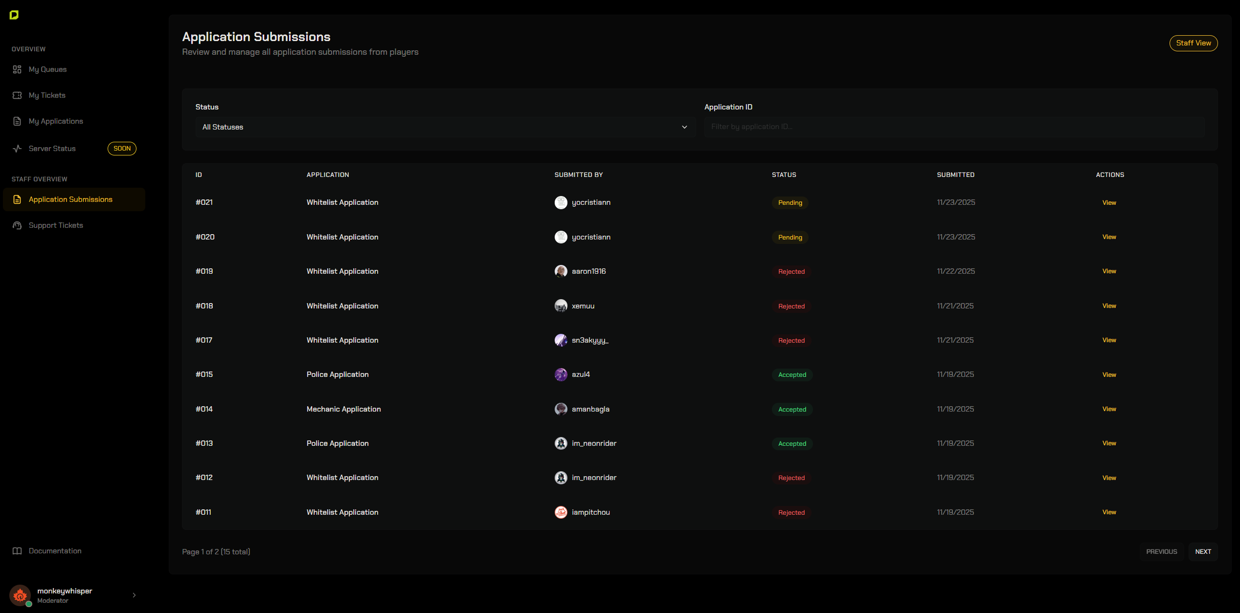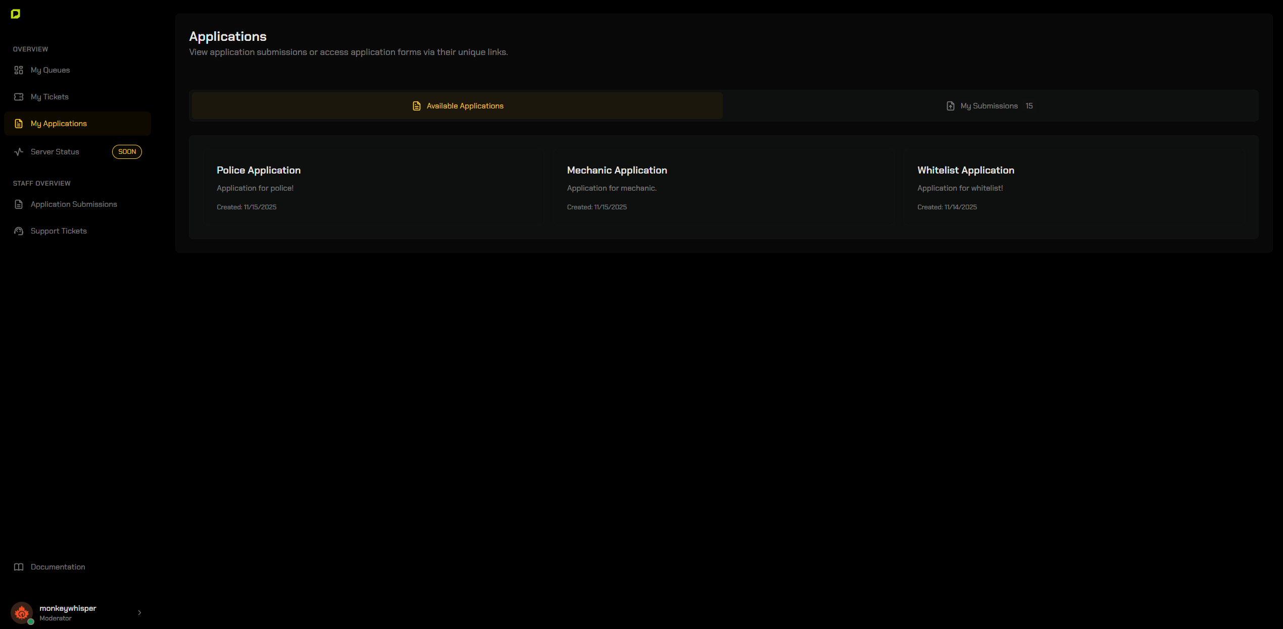 Create custom applications for whitelist, jobs, staff or anything else. Add unlimited questions. When you approve someone, the system can automatically assign Discord roles.