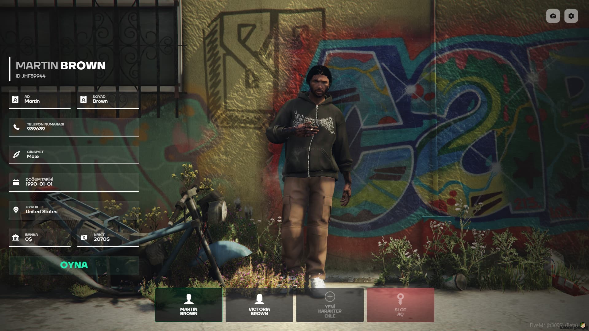 Detailed character information (Name, phone, cash, bank, gender, birthdate, nationality)