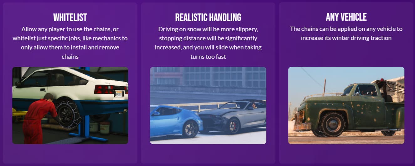 Bring true winter driving to your server with dynamically slippery snow and fully functional snow chains. Players can install chains on any vehicle for increased traction, with all setups saved and synced. Configure every detail to fit your server and optionally restrict installation to specific jobs