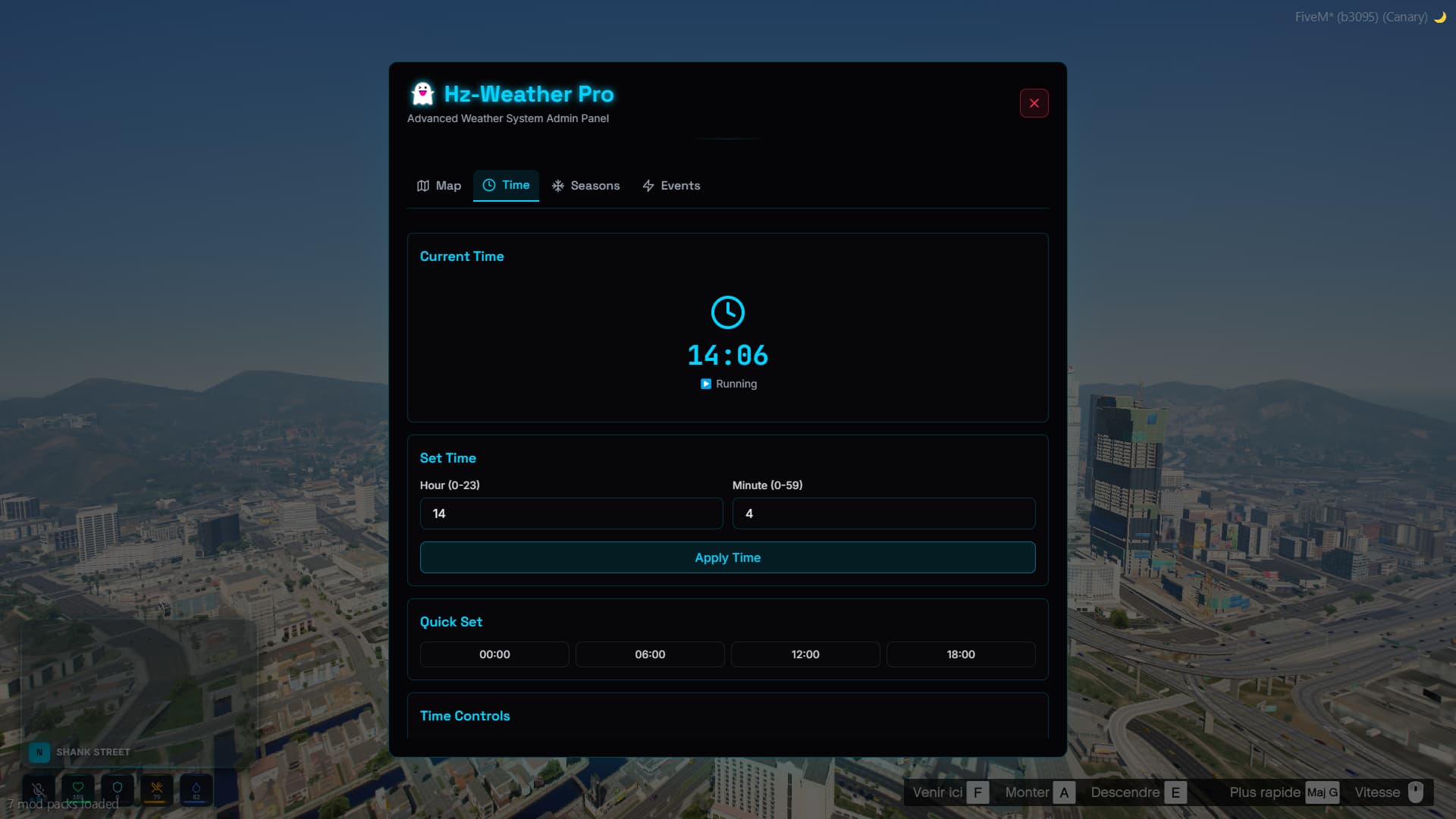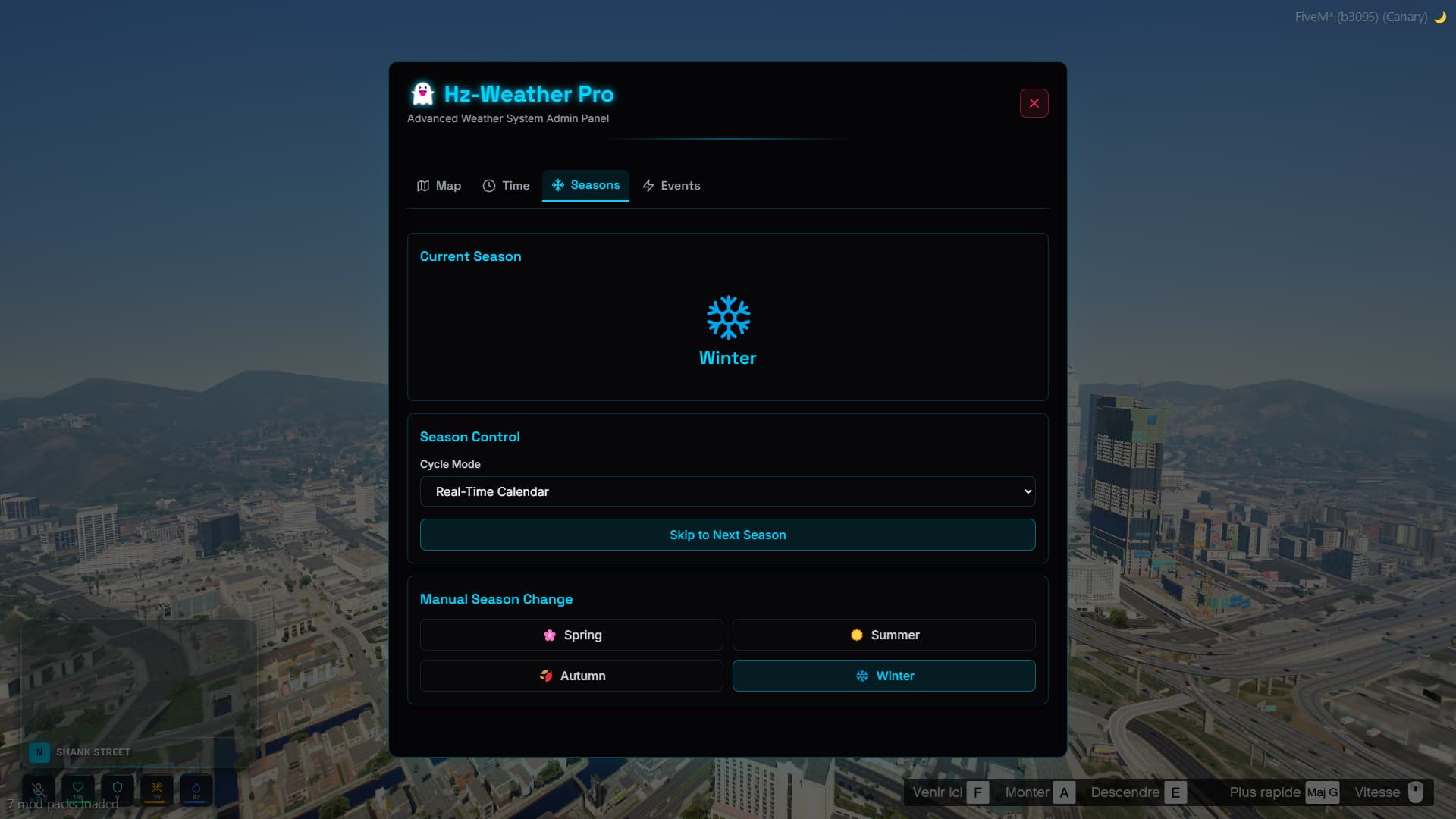 Time, Seasons, Temperature, Events. Live controls for all settings.